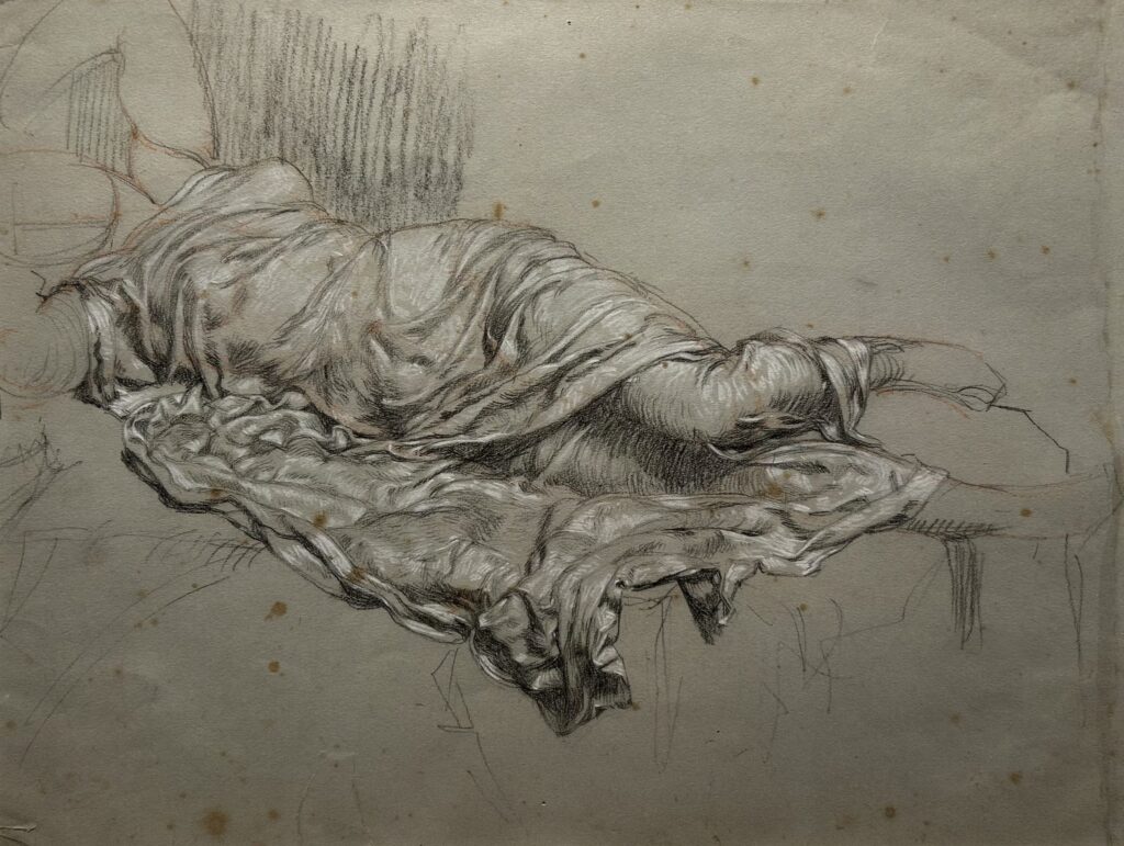 Alexander Rothaug (Viena, 1870 – 1946), Estudios sobre telas, carboncillo y lápiz sobre papel gris, hacia 1900. Procedencia: Patrimonio de Robert Seitschek (Viena, 1910 – Kufstein, 1990); Colección Friedrich Feiersinger, Tirol. Proveniente de una familia de artistas, Rothaug recibió una formación inicial de su padre y luego siguió una más rigurosa en la Academia de Viena, iniciando sus estudios de pintura en 1885, después de haberse dedicado a la escultura. En la Academia de Viena, el profesor Leopold Carl Müller, entonces un reconocido pintor y hoy considerado uno de los más eminentes de la escuela orientalista europea, dejó su huella en el joven estudiante. En 1892, tras finalizar su formación, se trasladó a Munich para empezar a trabajar como ilustrador para la revista Fliegende Blatter. Desde 1900 expuso numerosas veces en Viena y algunas veces en Alemania, y desde 1910 fué miembro de la Asociación de Artistas Visuales que, fundada en 1897 entre otros artistas por Gustav Klimt, encarnará las ideas de la Secesión Vienesa.