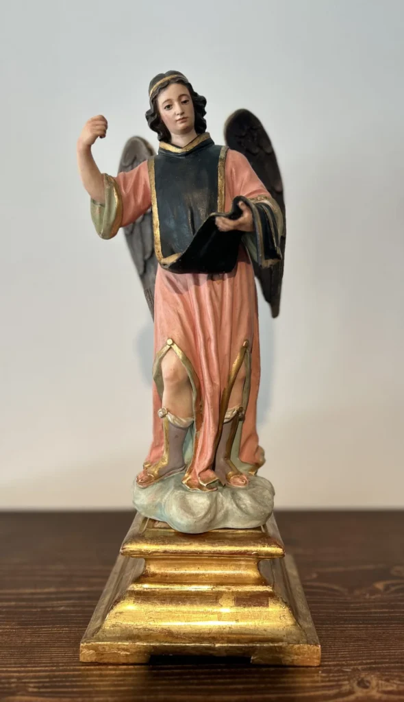 Delicada escultura en barro de procedencia granadina que representa al Arcángel San Rafael, con túnica rosada y escapulario negro con filo dorado. La iconografía que acompaña a esta figura alude a su representación dentro de las órdenes hospitalarias portando pan en su regazo para dar de comer a los necesitados.