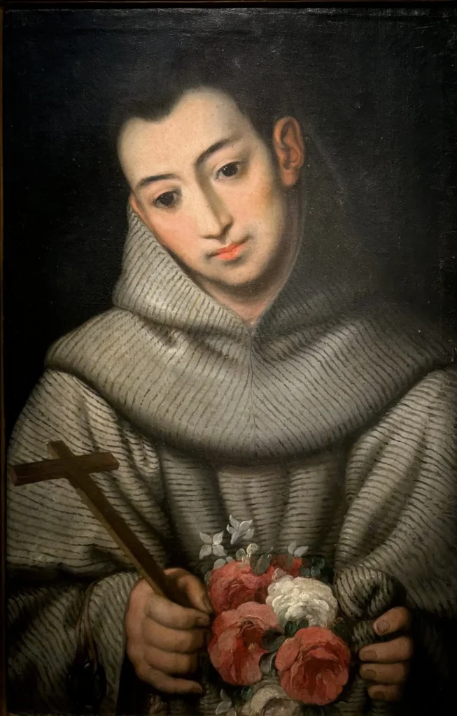 Representación de San diego de Alcalá con su capa llena de rosas evocando el milagro del fraile al que acompañan unas llaves que hacen referencia a su función conventual y una cruz de madera que sostiene en una de sus manos.