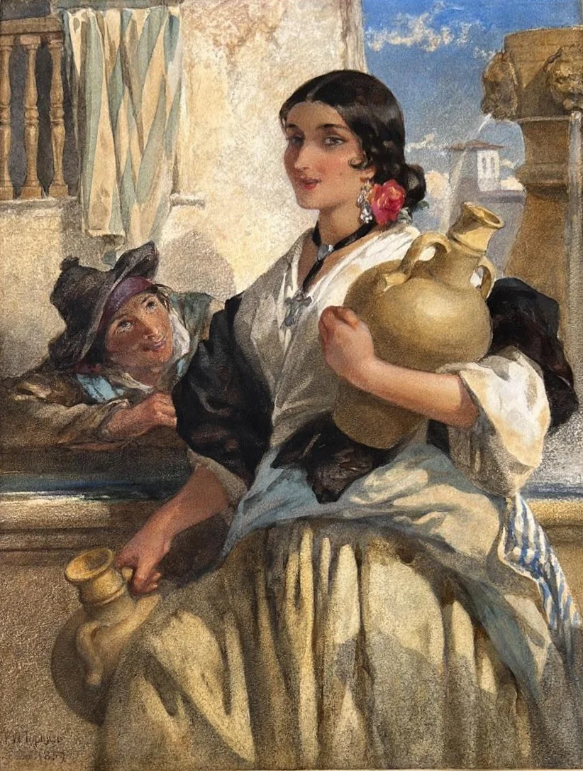 Francis William Topham (Leeds, 1808, Córdoba 1877). “Mujer española con cántaros”, acuarela sobre papel. 45 x 34,5 cm. Firmado y fechado en 1859. Topham se formó en el estudio de su tío que