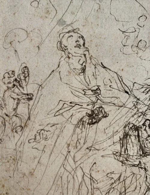 Santo con ángeles. Pluma ocre sobre papel verjurado pegado sobre cartulina con marca de la colección de Anatole Marquet de Vasselot, París. Diapositiva anterior Diapositiva siguiente PROANTIC SHOP