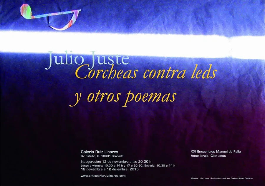 Bajo el título Corcheas vs leds Julio Juste presenta una instalación de tres poemas visuales cuyo tema común es la música. Desde hace años Julio Juste compatibiliza la pintura con ocasionales incursiones