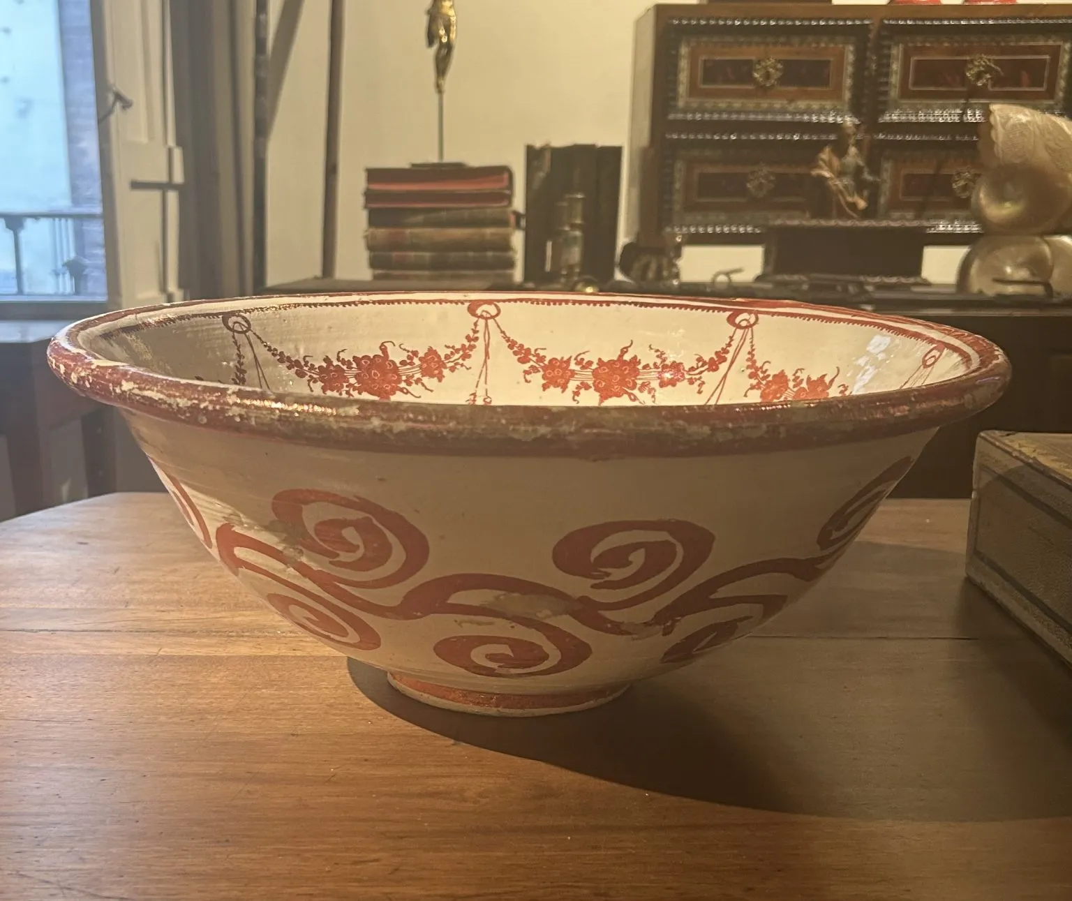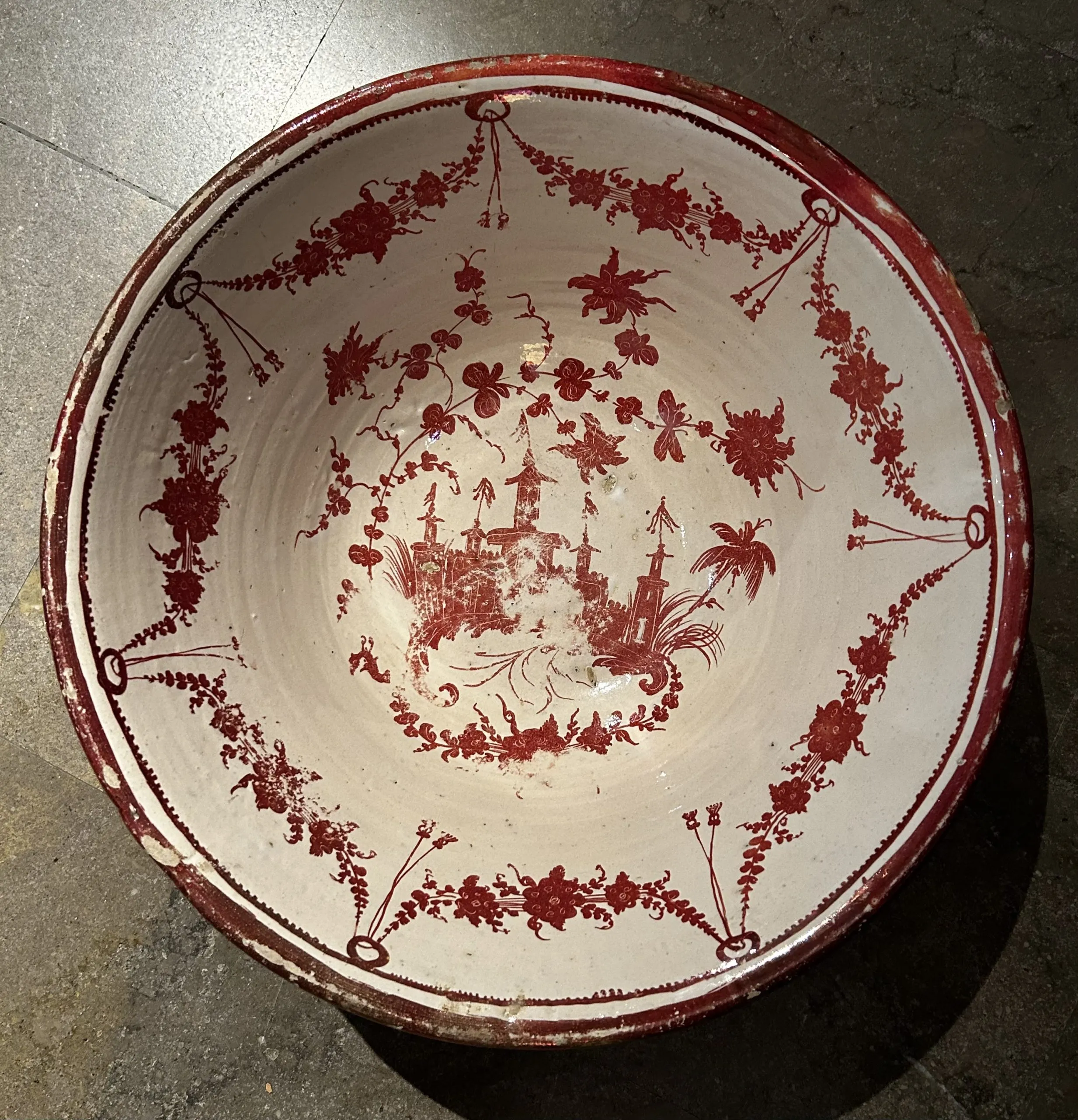 Zafa de cerámica de reflejo metálico cobrizo hacia 1770, Manises siguiendo los modelos alcoreños de la primera mitad del siglo con decoración oriental.