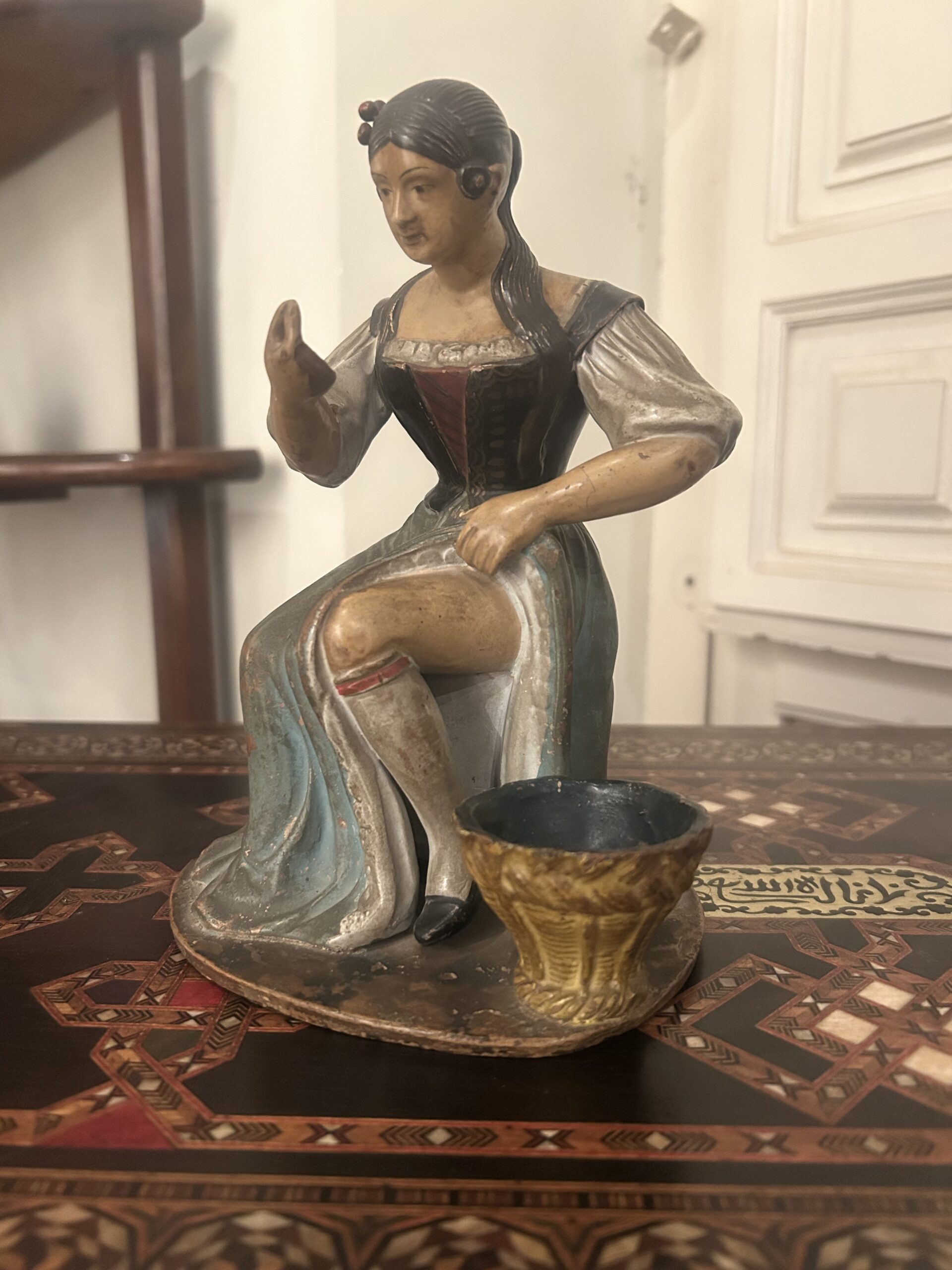 Barro malagueño del siglo XIX representa a una mujer acicalándose en una escena en la que deja ver parte de la pierna.