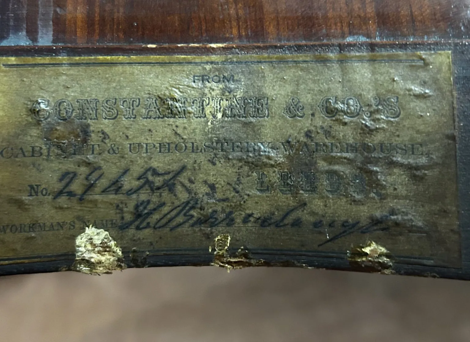 Pareja de sillas de caoba inglesas de época victoriana. El respaldo con curvatura tipo góndola remite a modelos de comienzos del siglo XIX, como los de Sheraton o Hepplewhite. Los asientos son de cuero verde y las patas delanteras tienen sus ruedas de bronce originales. 50,5 cm de ancho, 58 cm de alto y 60 cm de fondo. Ambas conservan la marca de producción Constantine & Co. con número de serie y el nombre de quién las fabricó.