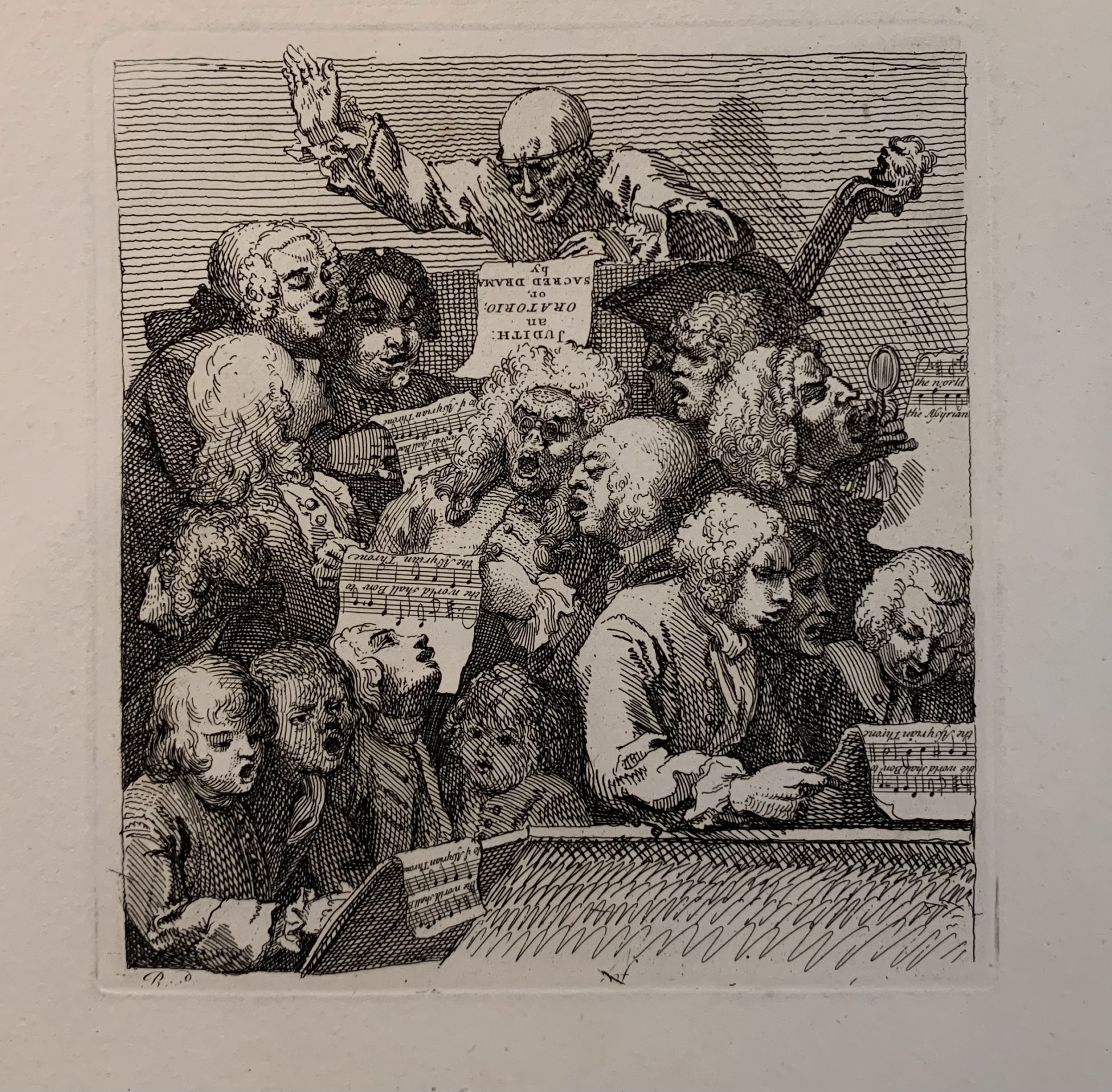 La escena representa la ejecución de un oratorio sobre el personaje de Judith, escrito por William Huggins con la música de William Defesch, que fue estrenada en febrero de 1732 en el Lincoln´s Inn Fields. La obra fue un completo desastre y no se representó más, entre otras cosas porque el propio manuscrito desapareció. Para su estreno se contrató a la cantante Cecilia Young quien fue despedida por su mal comportamiento, disimulado por una fingida enfermedad. El director del coro es representado exagerando los movimientos y es esa energía la que hace que se le caiga la peluca, guiando al coro hacia un completo despropósito.